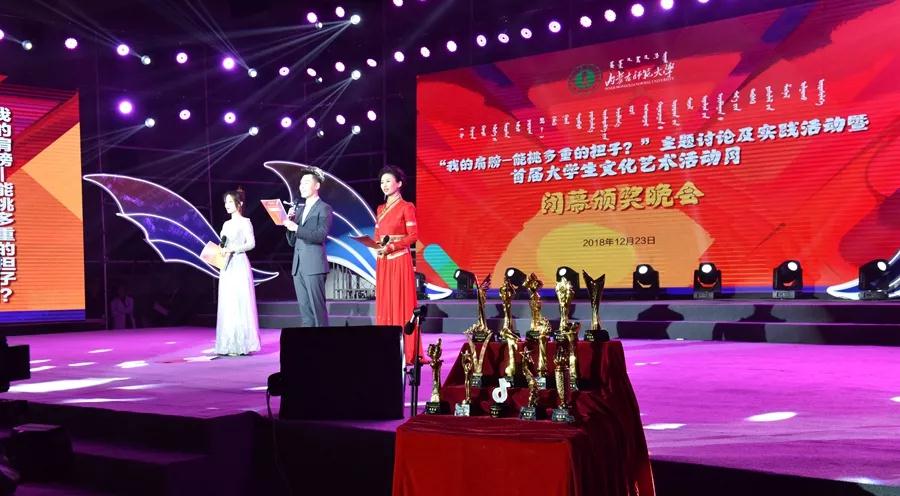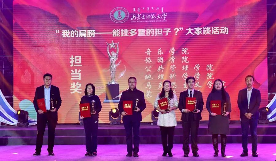 12月23日晚,pp电子游戏官网“我的肩膀——能挑多重的担子?”主题讨论及实践活动暨首届大学生文化艺术活动月颁奖晚会在赛罕校区体育馆举行。校党委书记黄雅丽,党委副书记、纪委书记高云峰,副校长刘九万,党委委员、党委宣传部部长张宝成及相关部门负责同志出席活动并为获奖师生颁奖。pp电子官网党总支书记贺瑞,副书记、副院长阿荣,团总支书记范晓刚以及付桂军教授参加了本次活动。