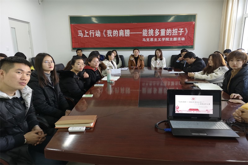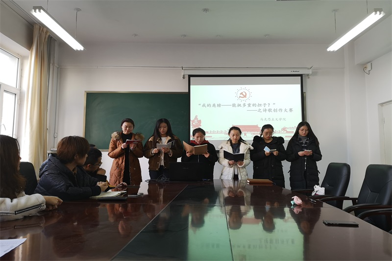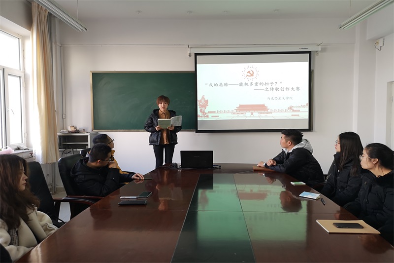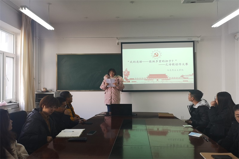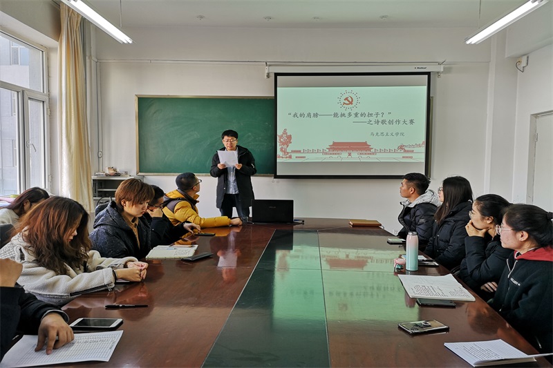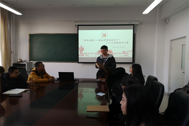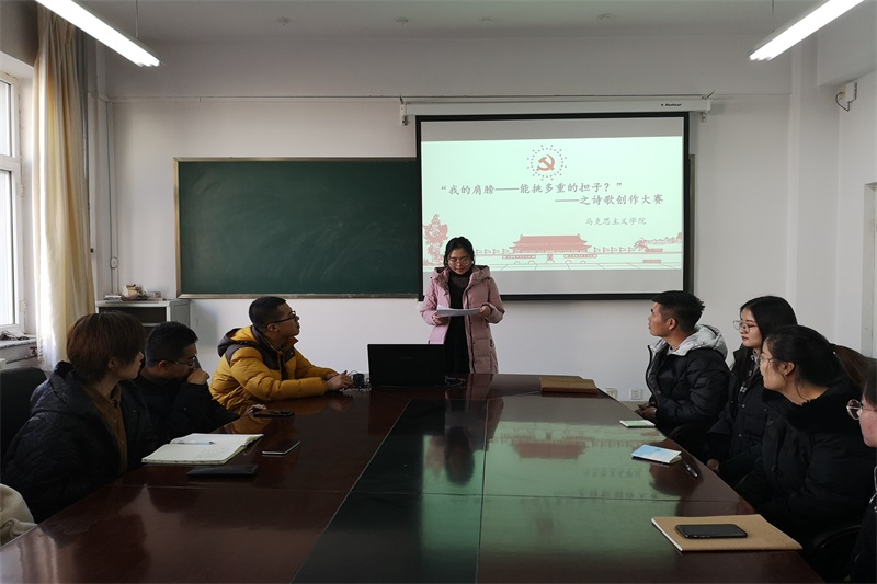 2018年12月18日中午,pp电子官网在盛乐校区学院楼B216举办“诗歌创作”活动。团支部书记范晓刚老师及研一、研二全体研究生参加了本次活动。