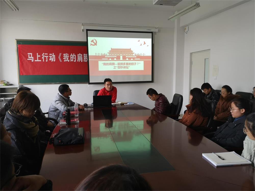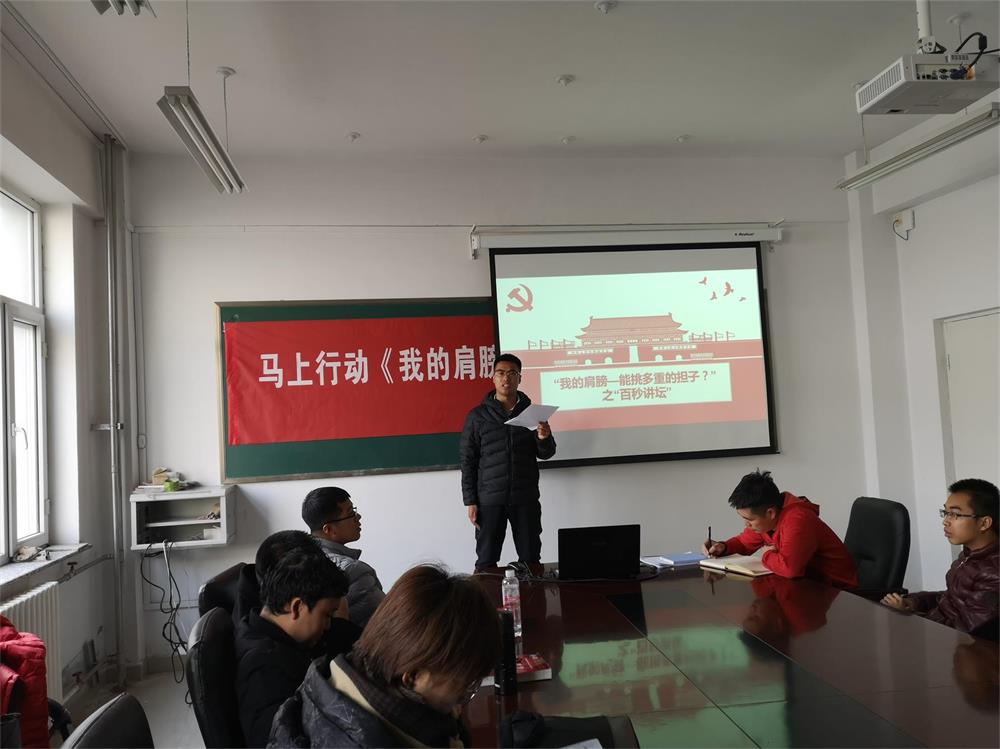 为响应在全校组织开展的“我的肩膀—能挑多重的担子?”主题讨论及实践活动,pp电子官网于2018年11月20日中午在盛乐校区学院楼B216举办“百秒讲坛”活动。团总支副书记范晓刚老师及研一、研二全体研究生参加了本次活动。