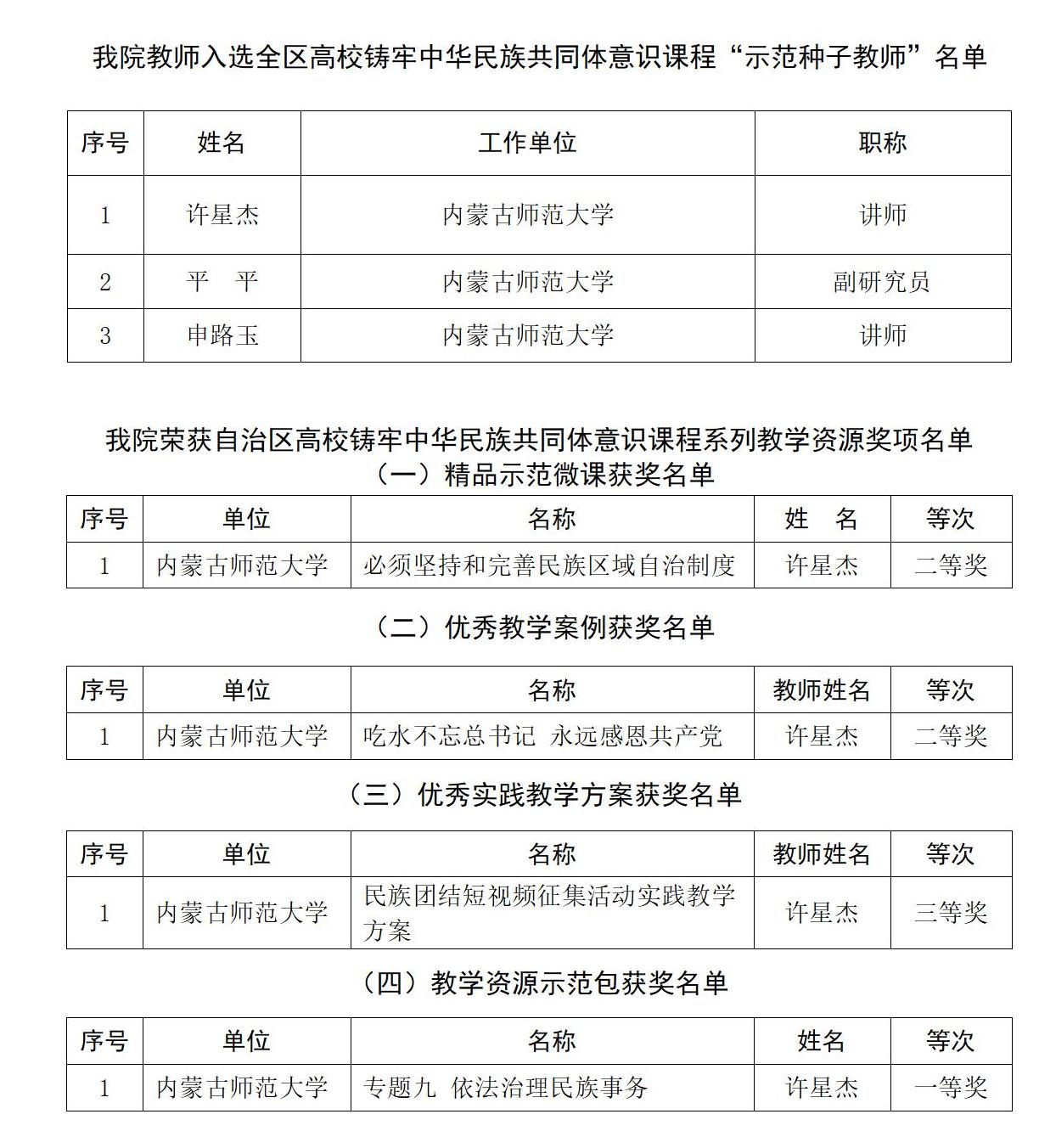 近日,自治区教育厅公布了自治区高校铸牢中华民族共同体意识课程“示范性种子教师”名单和系列教学资源获奖名单,pp电子官网铸牢中华民族共同体意识课程教研室3位青年教师许星杰、平平、申路玉被评为“示范性种子教师”;许星杰荣获自治区高校铸牢中华民族共同体意识课程系列教学资源奖项4项,包括“教学资源示范包”一等奖、“精品示范微课”二等奖、“优秀教学案例”二等奖和“优秀实践教学方案”三等奖。