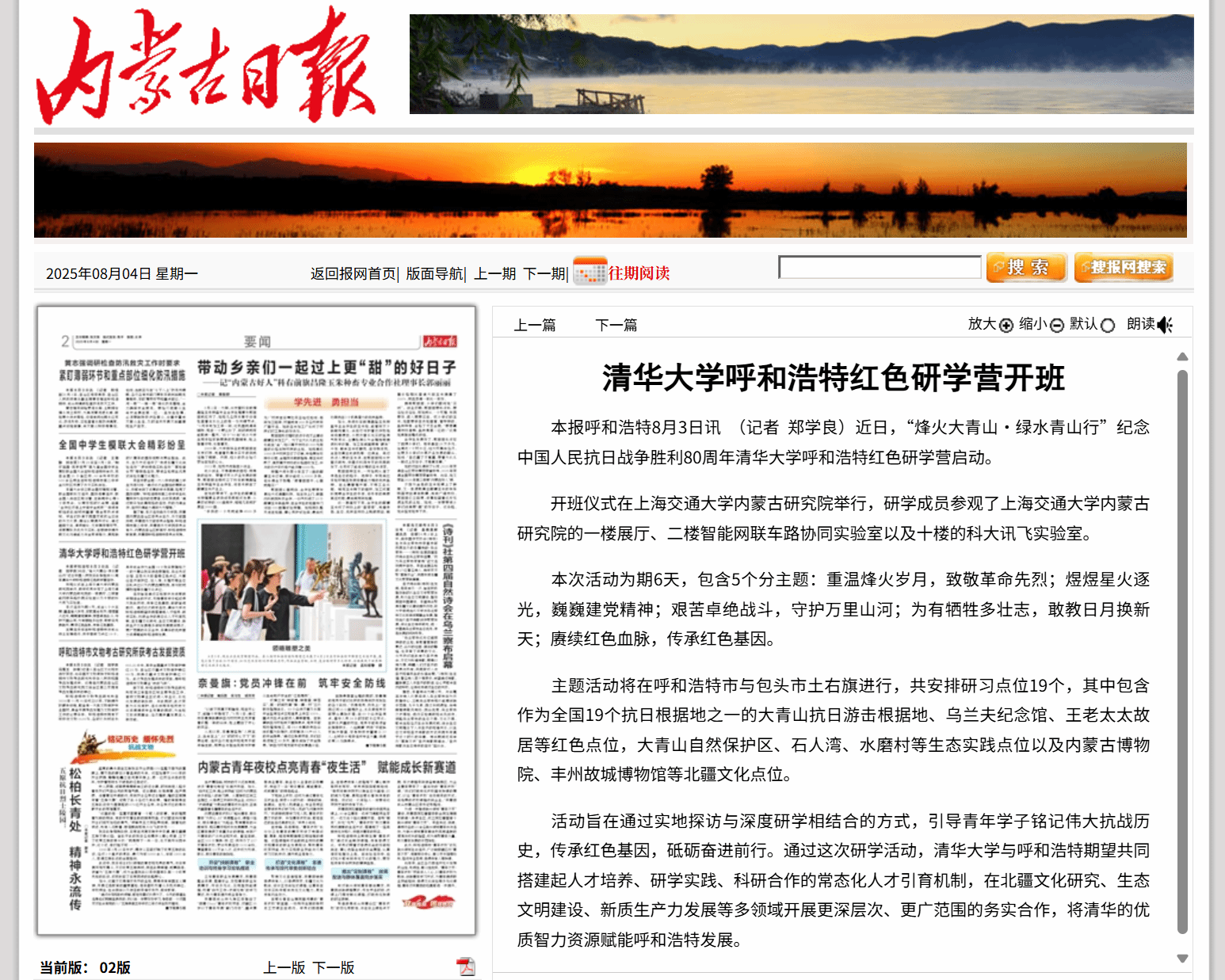 7月31日至8月5日,“烽火大青山・绿水青山行”纪念中国人民抗日战争胜利暨世界反法西斯战争胜利80周年清华大学呼和浩特红色研学营顺利开展。此次研学活动由呼和浩特市社会科学联合会、清华大学日新书院联合主办,pp电子游戏官网、上海交通大学内蒙古研究院等单位协办。本次活动为期6天,包括5个分主题,在呼和浩特市与包头市土右旗的19个研习点位开展,旨在引导青年学子铭记抗战历史、传承红色基因,推动清华大学与呼和浩特在人才培养、科研合作等领域的深度联动。