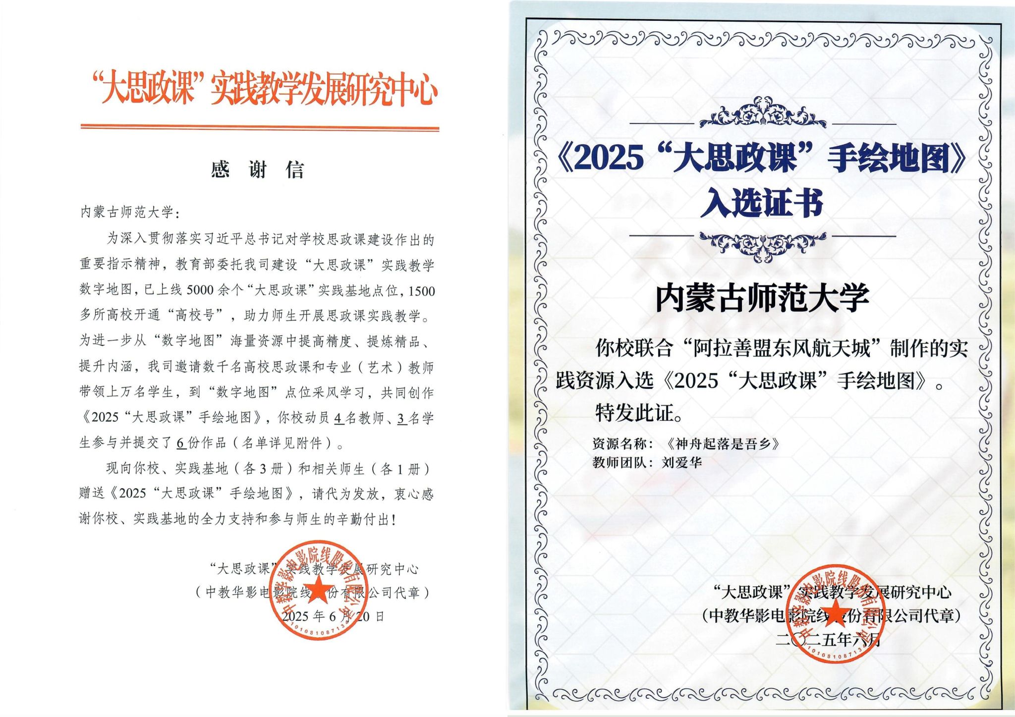 团队紧扣习近平总书记对思政课建设的重要指示精神,以“东风航天城”这一国家航天事业重要基地为实践载体,通过实地采风、史料挖掘和艺术创作,将航天精神、民族团结与边疆发展等思政元素融入作品。6份提交作品中,既有航天科技成就的生动呈现,也有内蒙古自治区在筑牢祖国北疆安全屏障中的时代担当,为全国思政课教学提供了兼具地域特色与时代内涵的优质资源。
