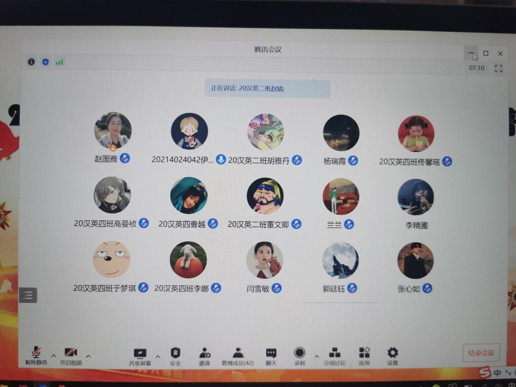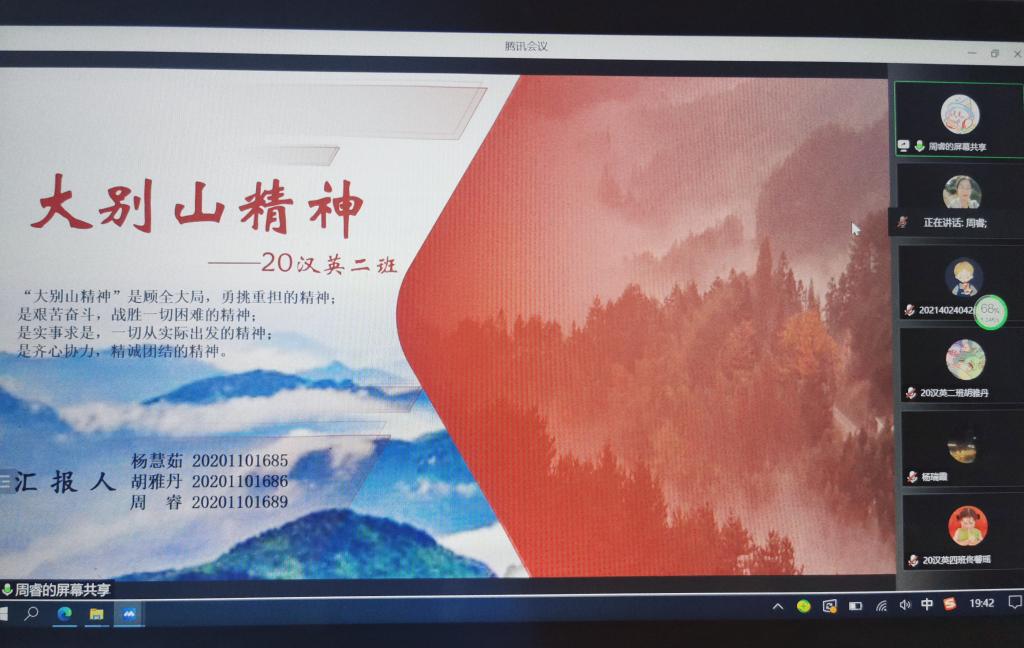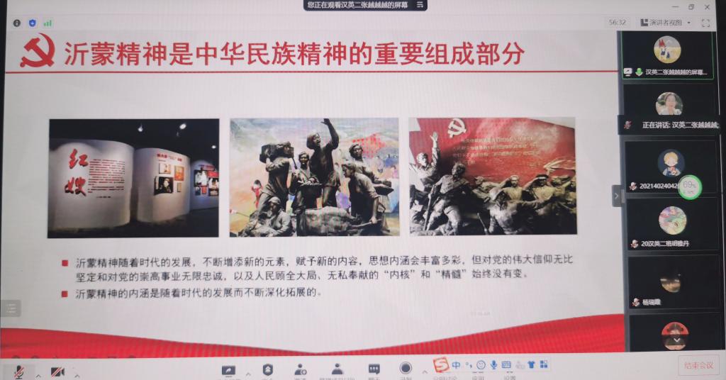 宣讲活动中,2020级汉英2班、汉英4班的本科生结合中国近代史纲要课程所学内容“以PPT汇报,小组合作”的形式对新民主主义革命时期中国共产党人的精神谱系井冈山精神、延安精神、长征精神、红颜精神等进行解读分析学生们从革命精神的内涵、发展历程、典型人物和时代价值等方面进行了深刻分析,并对沂蒙母亲—王换于的故事、白山黑水间的抗日英雄杨靖宇的故事、红颜巾帼饶国模、彭灿碧的故事进行了精彩演讲。
