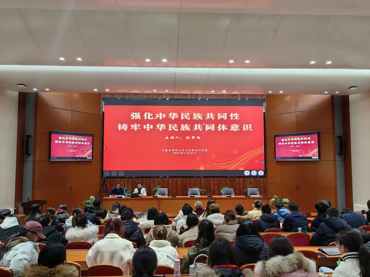 孙秀玲教授以“强化中华民族共同性,铸牢中华民族共同体意识”为题,全面系统地阐述了铸牢中华民族共同体意识的“主线”,从“是什么?”、“为什么?”、“怎么办?”三个维度对铸牢中华民族共同体意识的科学内涵、重大意义和有形有感有效推进铸牢中华民族共同体意识教育进行了深入解读。在讲座过程中向大家阐释了铸牢中华民族共同体意识的重要性,她强调:“铸牢中华民族共同体意识是习近平总书记关于民族工作的重大原创性论断,是马克思主义民族理论中国化时代化民族化的最新成果,是我们做好民族工作的根本遵循”。