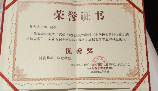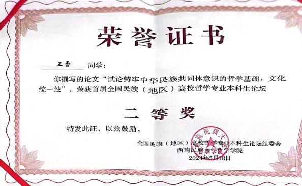 pp电子官网哲学系本科生王小丫的论文“试论概念框架在塑造民族共同体认知中的应用价值”、王雪荣的论文“试论铸牢中华民族共同体意识的哲学基础:文化统一性”荣获二等奖,乌云其木格的论文“试析当代民族哲学视域下中华民族共同体意识的价值意蕴”荣获优秀奖。