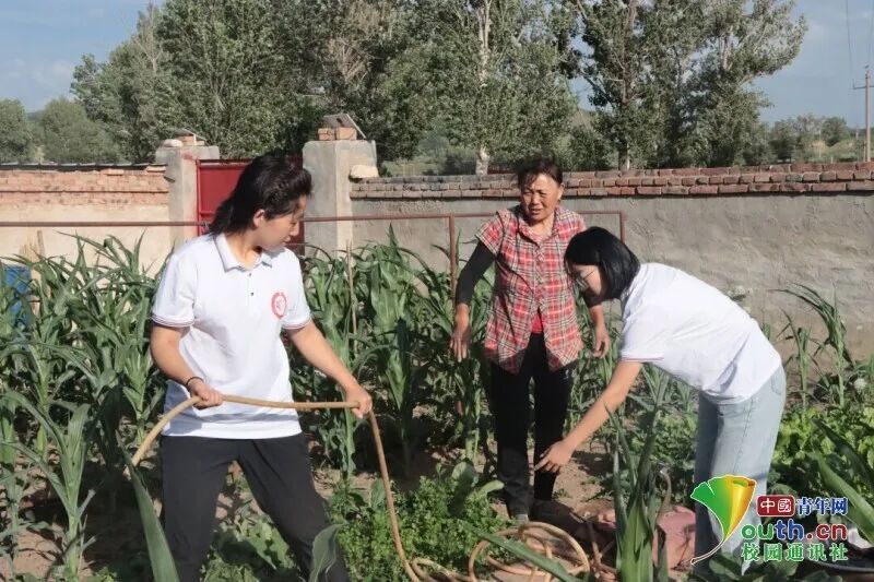 图为志愿队成员在其所住农户家中给菜园浇水。中国青年网通讯员 陆蝶 供图