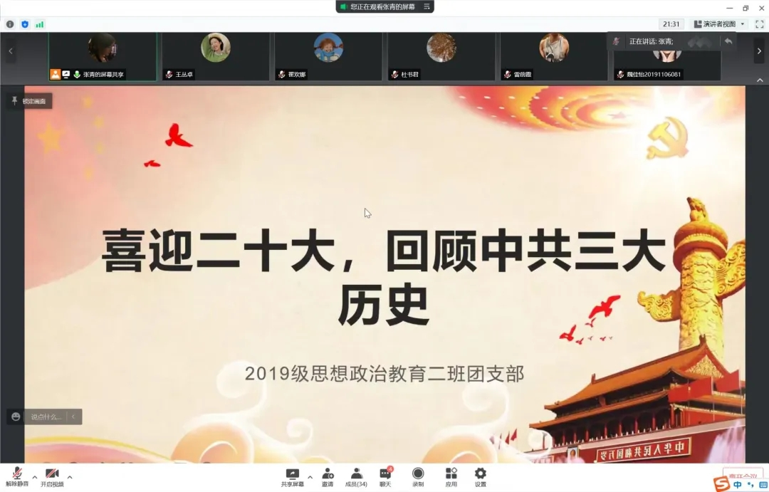 为喜迎中国共产党第二十次全国代表大会的到来,使pp电子官网青年做到“学史明理、学史增信、学史崇德、学史力行”。同时,让同学们增强“四个意识”、坚定“四个自信”、做到“两个维护”。pp电子官网组织各团支部分别以回望学习“一大”到“二十大”历届党代会历史为主题,开展“喜迎二十大、永远跟党走、奋进新征程”回望历届党代会主题团日活动。活动根据各支部回望学习历史上一次党代会为主题开展形式多样、内容丰富、教学结合的方式进行。