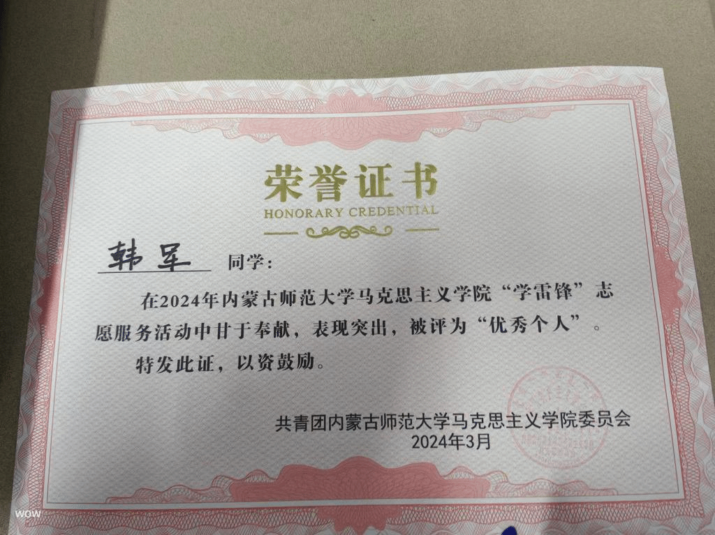 pp电子游戏官网“学雷锋”志愿服务活动中被评为优秀个人(2024年3月)