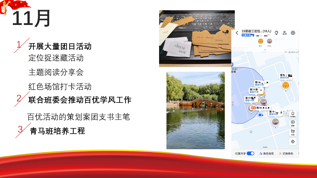 在班级日常学习生活中,班团成员在班委会和团支部的精心组织策划下开展了各种文化活动,如主题班会、团组织生活、阅读交流会等等,在丰富了校园生活的同时,增进同学间的友谊。他们发挥创意,策划了一场场精彩纷呈的表演,展现了自身才艺。通过这些活动,班级凝聚力得到了进一步提升,从而增强集体的凝聚力和向心力,在交流协做中促进自身的全面发展。