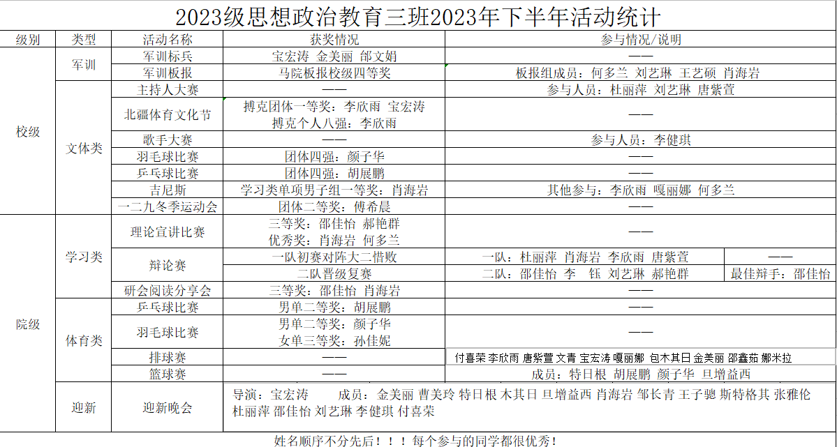 2023级思想政治教育三班立足实践,班级同学齐心协力,班级干部兢兢业业,为班团建设一同出谋划策,在放矢有的中共铸了班级的辉煌。通过各种团队活动,同学们为了集体的利益而努力,从而增强集体的凝聚力和向心力,在交流协做中促进自身的全面发展。